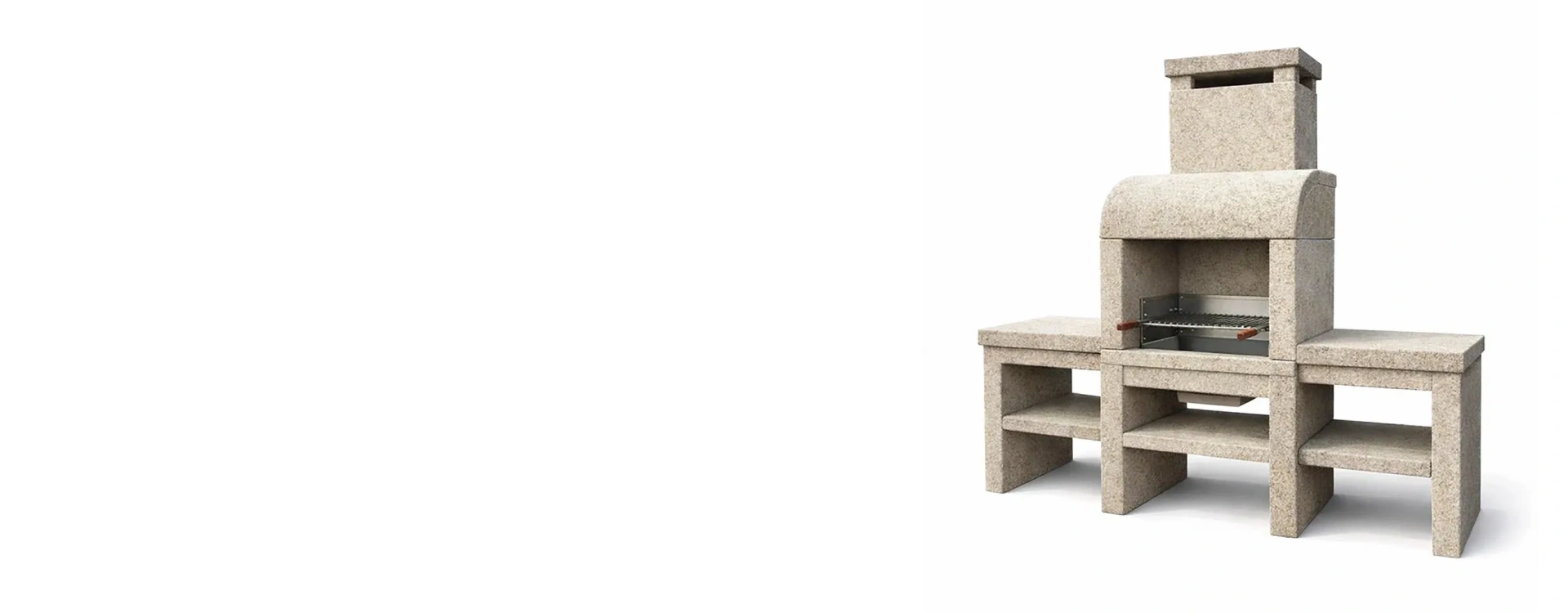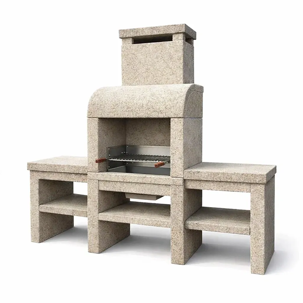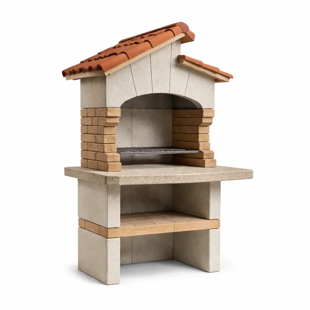 Ce barbecue extérieur est composé de béton et de briques en terre cuite, avec un toit en tuiles rouges offrant une résistance accrue aux intempéries. La grille est en acier inoxydable.
